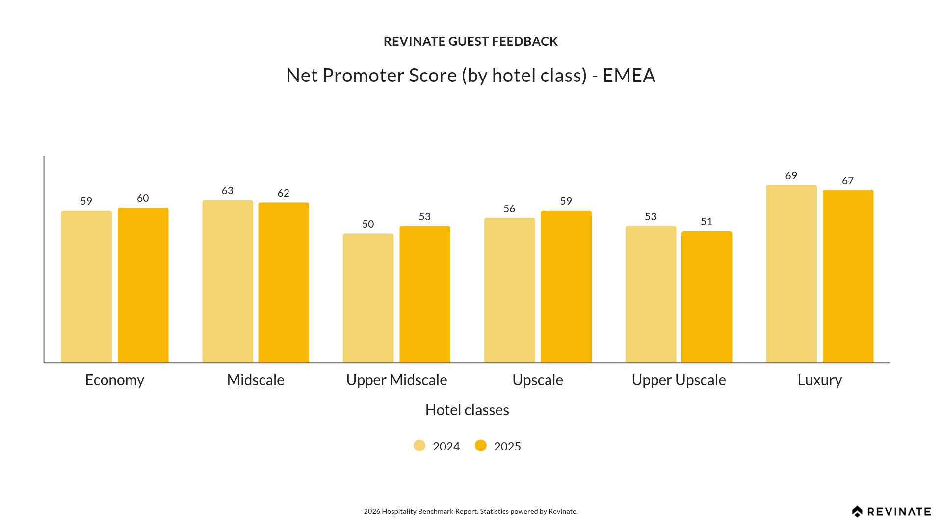 EMEA Luxury maintains a strong NPS at 67, while Midscale properties lead the region at 62, demonstrating that mid-tier hotels excel at creating guest advocacy in European markets. Upscale properties achieved solid improvement (up three points to 59), as did Upper Midscale (up three points to 53), while Economy improved to 60. Strong performance across value and mid-tier segments (60-62) shows EMEA properties deliver compelling guest experiences regardless of price tier.