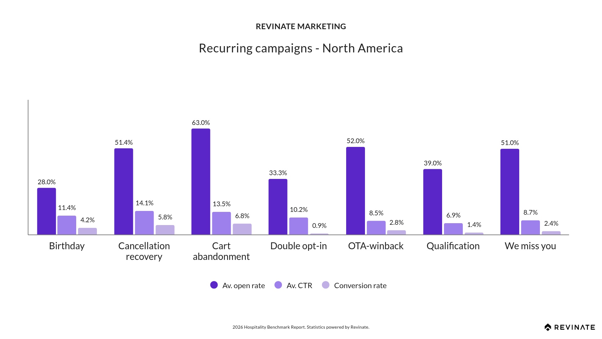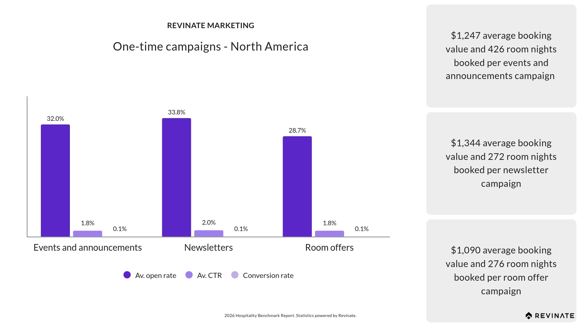 The 2026 Hospitality Benchmark Report helps hoteliers assess performance, pinpoint improvements, and set goals. These email marketing benchmarks focus on North America’s email channel for segmentation impact, campaign performance, upsells, and surveys.