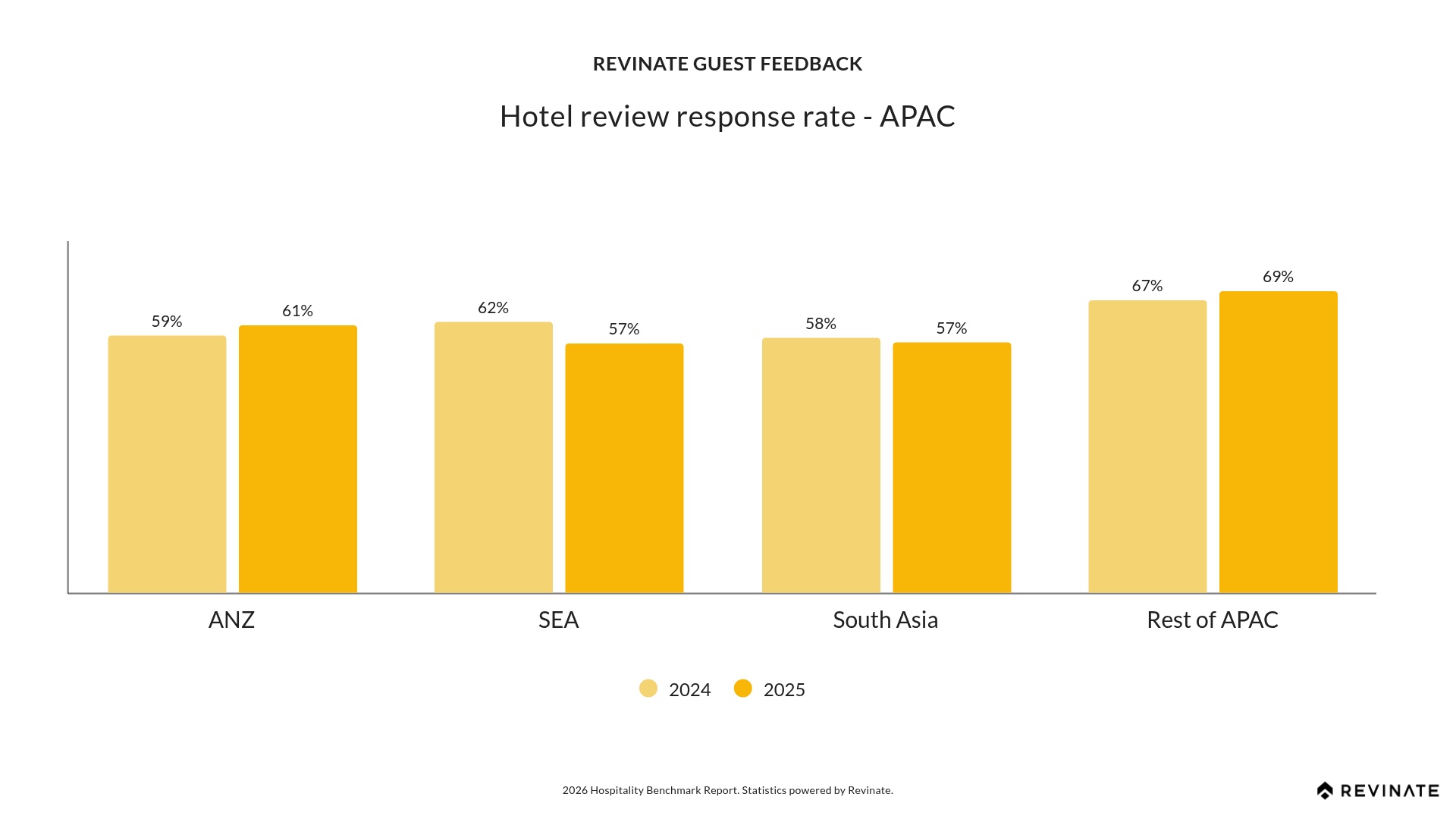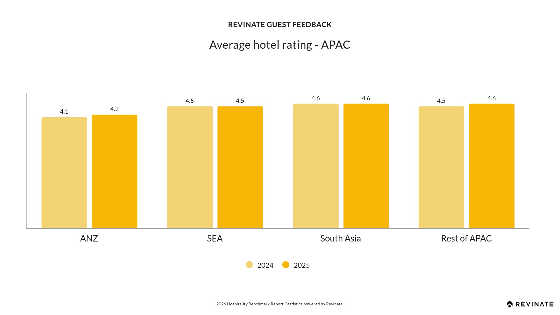 APAC delivers the highest guest satisfaction ratings globally, with South Asia and the rest of APAC both achieving 4.6. The rest of APAC pairs this top rating with the only positive review response rate change globally (+2.02 points), demonstrating that operational excellence and guest satisfaction go hand in hand. Australia/New Zealand improved to 4.2 (+0.1), showing continued positive momentum across the region’s strong service culture.