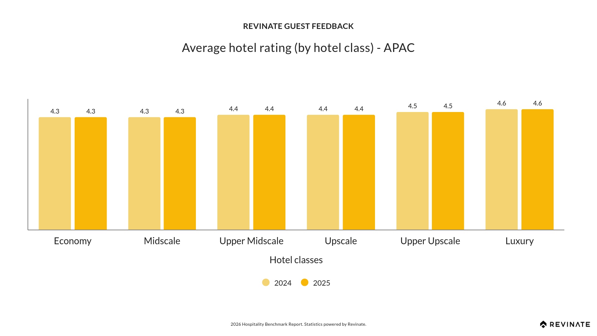 APAC’s hotel ratings show the narrowest spread of any region, just 0.3 points from Economy (4.3) to Luxury (4.6), reflecting consistently strong service delivery across all price points. Economy and Midscale properties both achieve 4.3, outperforming global Economy (3.9) and matching global Upscale standards. This consistency is a competitive advantage for the region: guests at every tier experience high-quality service, building trust and driving repeat stays across all hotel classes.