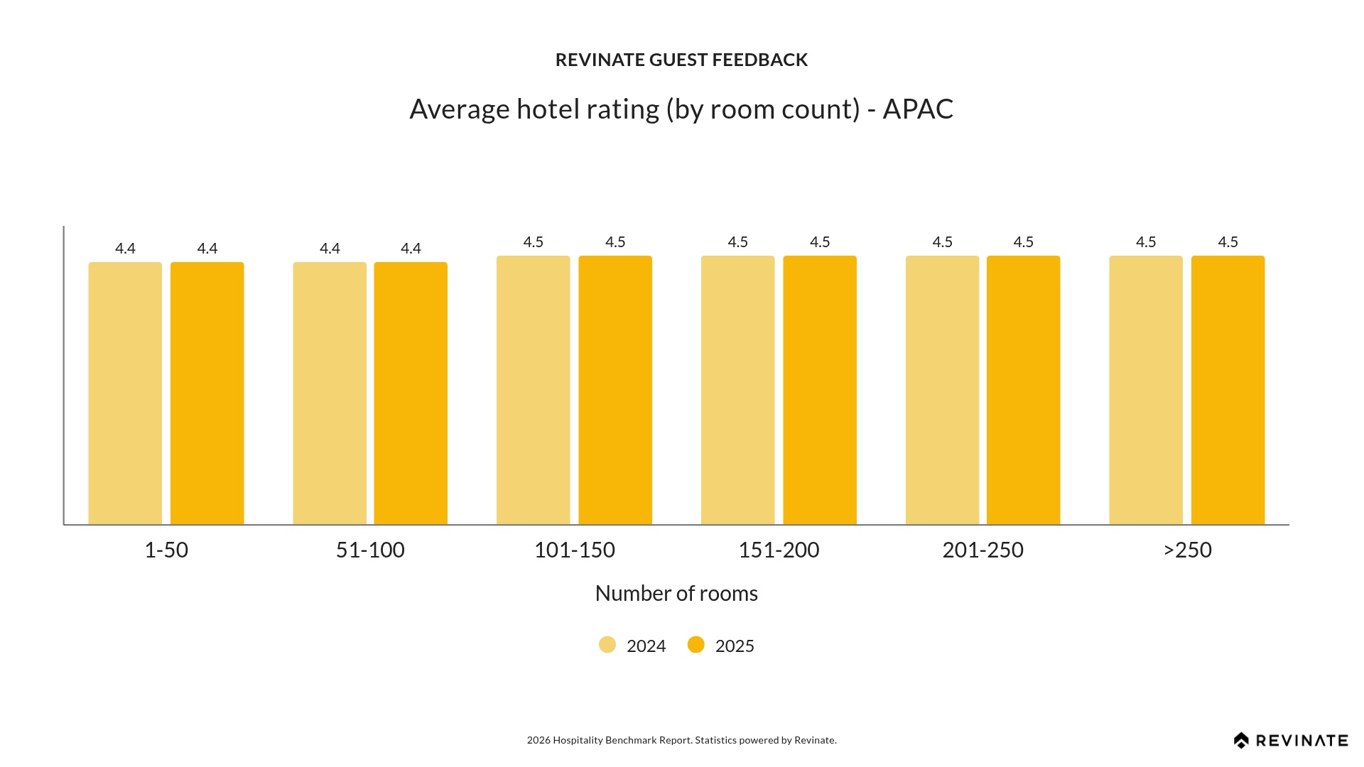 APAC properties achieve strong ratings across all sizes, with a step up from 4.4 to 4.5 at the 101-room threshold, earlier than the global pattern where the advantage appears at 151+ rooms. This consistency within each tier (4.4 for properties under 101 rooms, 4.5 for those above) demonstrates that APAC hoteliers maintain service quality as they scale, delivering strong guest experiences regardless of property size.