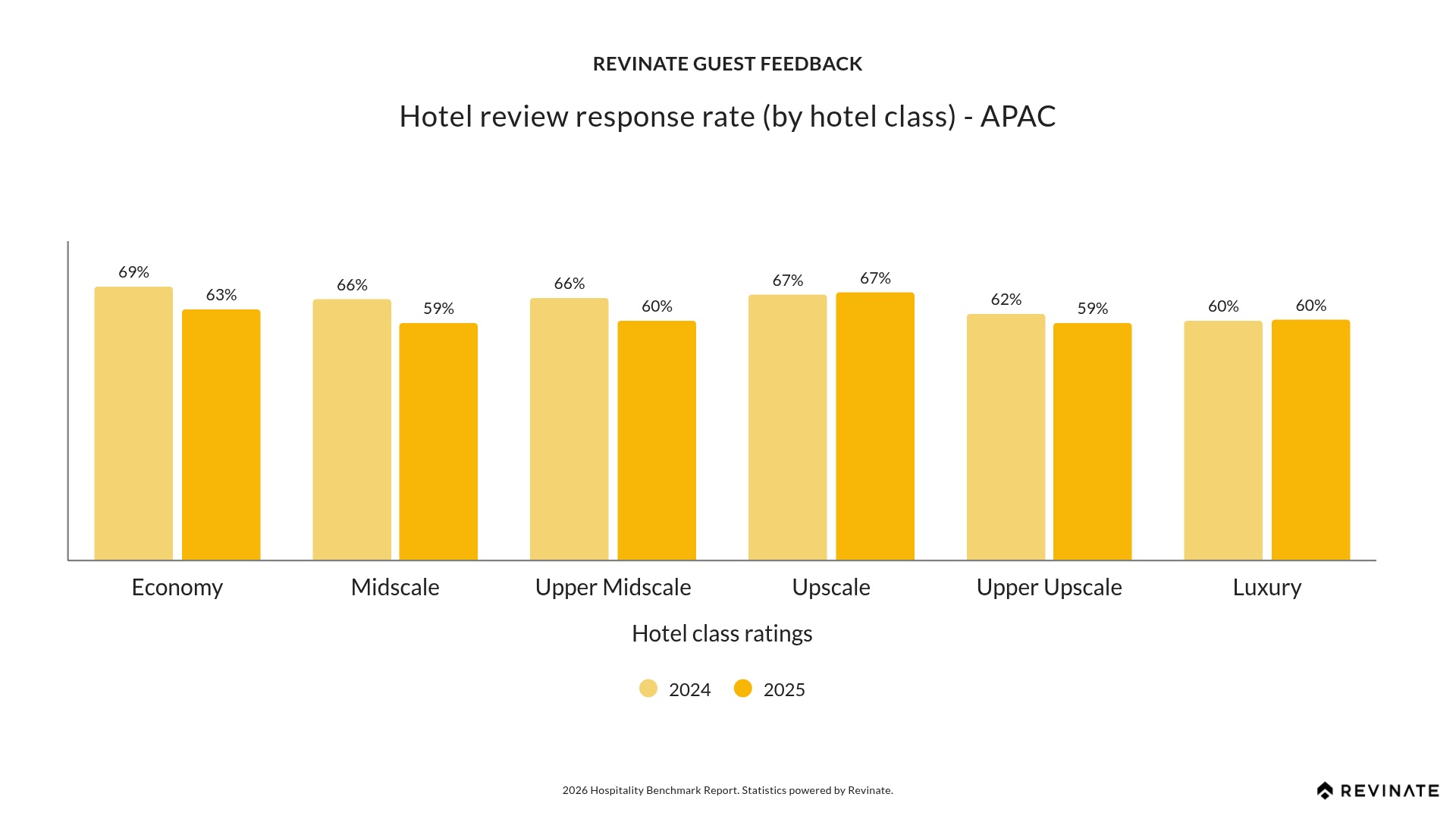 APAC maintains strong review response rates across all hotel classes (59-67%), with Economy properties responding to nearly two-thirds of reviews (62.91%), a testament to the region’s guest engagement culture. Upscale (+0.70 points) and Luxury (+0.05 points) maintained or improved their rates, demonstrating effective review management at scale. As review volumes grow, value-segment properties have an opportunity to adopt the workflow efficiencies that premium segments use to maintain strong response rates.