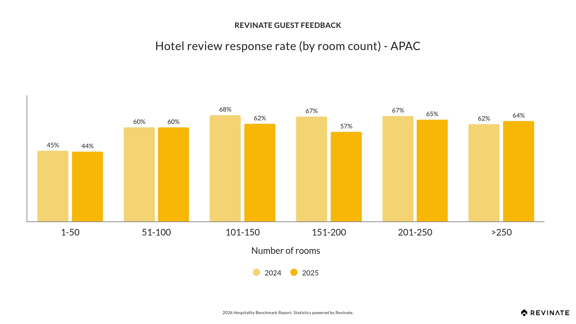 APAC’s largest properties (250+ rooms) are the only size segment globally to improve response rates, gaining +2.10 points to reach 63.86%. This achievement demonstrates what’s possible when properties invest in review response infrastructure. Mid-sized and smaller properties across APAC have an opportunity to adopt similar practices. For properties with one to 50 rooms (44.46%), even modest improvements in response efficiency can meaningfully boost online visibility and guest trust.