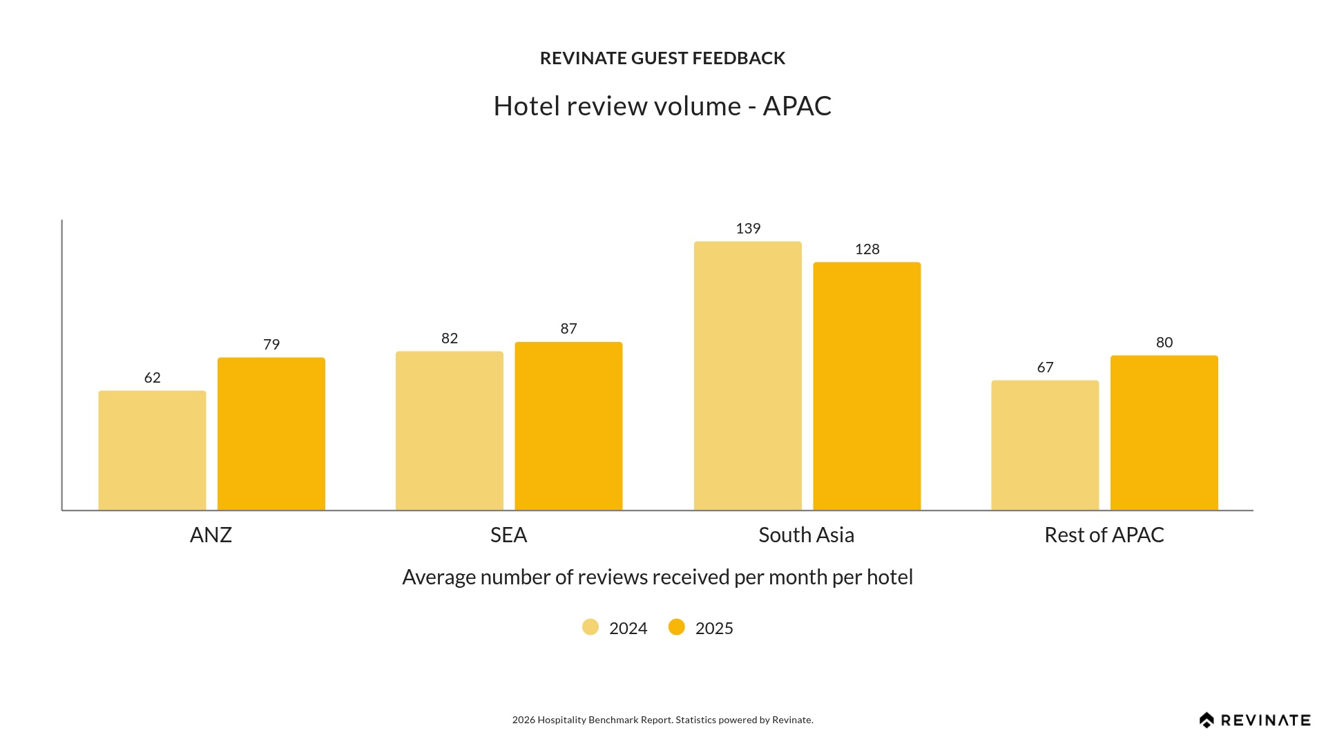 APAC’s review volumes match or exceed global averages across every property size, with hotels of 250+ rooms generating 150 reviews per hotel. Mid-sized properties (51-100 rooms at +13% and 101-150 rooms at +12%) are showing the strongest growth, reflecting improved review solicitation at these tiers. All segments are trending upward, and the consistent performance across property sizes confirms APAC’s strength in guest engagement and review generation.