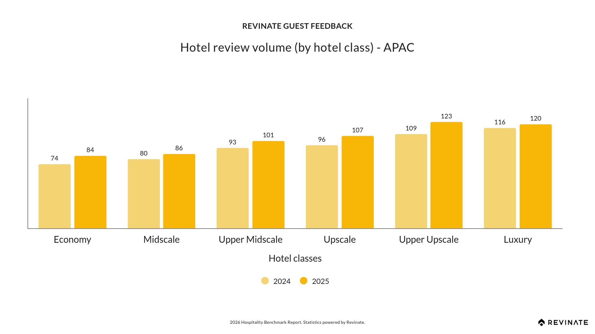 APAC review volumes exceed global averages across every hotel class, from Economy (84 vs. 41 globally) to Luxury (120 vs. 94 globally). Upper Upscale shows the strongest growth at +13%, adding 14 reviews per hotel YoY. This consistent performance across all classes reflects a region-wide commitment to guest feedback collection. Strong review volumes contribute directly to online visibility, guest trust, and booking conversion, reinforcing the value of APAC’s engagement-first approach.