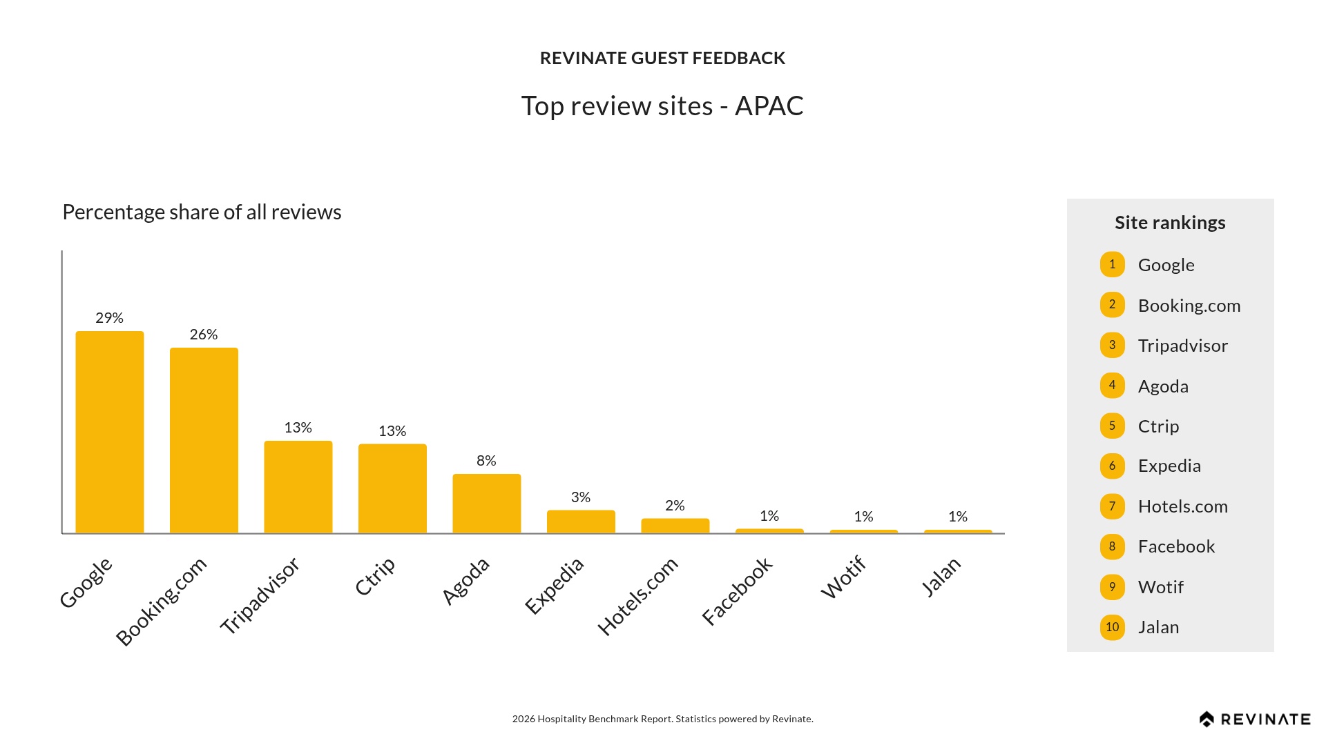 APAC has the most balanced review platform distribution globally, with Google (28.58%) and Booking.com (26.25%) nearly tied at the top. Regional platforms play a larger role than anywhere else: Ctrip (12.77%) and Agoda (8.48%) together account for over 21% of reviews. This diversity means APAC hotels benefit from a multi-platform reputation strategy, and Google’s leading position underscores the importance of Business Profile optimization for search visibility.