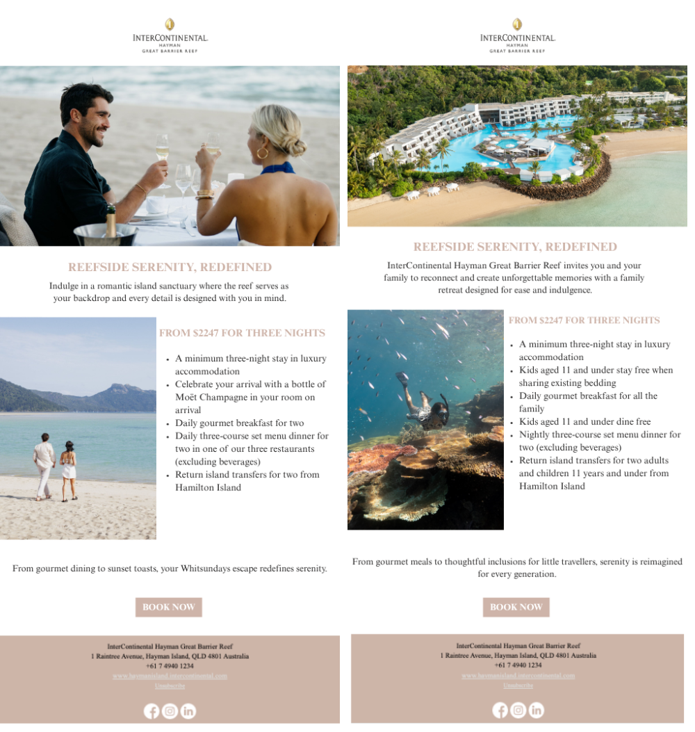 InterContinental Hayman Great Barrier Reef launched a personalized three-night promotional campaign specifically tailored for two key audience segments: couples and families. While the core offer remained the same, the hotel developed distinct versions for each group, utilizing unique imagery, customized subject lines, and messaging that addressed their specific needs. Couples received a more romantic, luxury-focused version, while families were shown a more playful variation that featured family-friendly imagery and details. By segmenting past reservations to identify guests who had traveled with children, the property ensured that each audience received an offer that felt relevant and personal. This approach ultimately enhanced engagement and increased direct bookings.