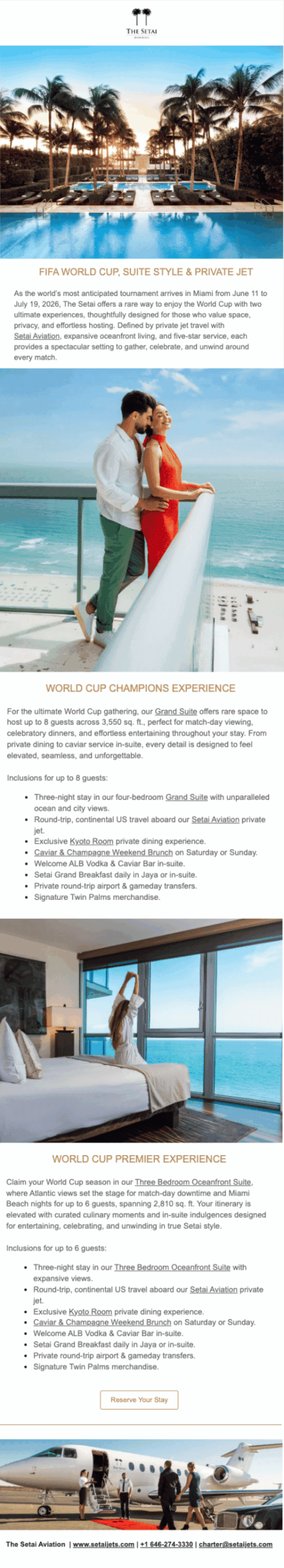 This campaign exemplifies experience-led marketing, where The Setai Miami Beach sells a “once-in-a-lifetime” luxury experience rather than just a hotel suite. By leading with the 2026 FIFA World Cup, a rare global event, they create a sense of urgency and exclusivity. This campaign moves beyond “selling a bed” and instead offers an answer to the logistical chaos that comes with major city events. The Setai intelligently bundles the stay with private jet travel, gameday transfers, and other perks, essentially removing every “pain point” a guest might have about traffic and crowds and elevating the stay in many different ways. They make it easy for travelers to say “yes” to a total package. Finally, by putting their aviation wing front and center, they transform a standard stay into a seamless, door-to-door luxury experience, putting the experience angle at the forefront of this campaign.