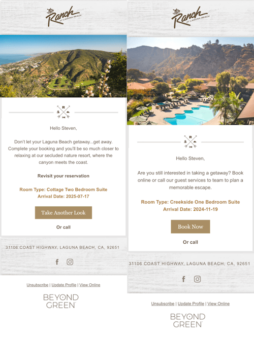 The Ranch at Laguna Beach in California successfully drives direct revenue with an automated cart abandonment drip campaign. This two-part email series re-engages guests who started a booking but didn’t complete it.